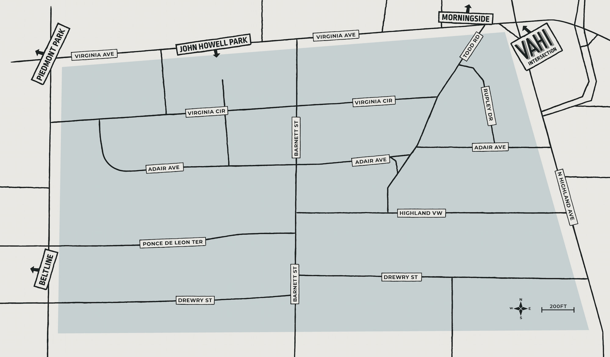 Barnett St., Virginia Cir., Adair Ave., Highland View, Ponce de Leon Terr., Drewry St., Rupley Dr., Todd Rd., De Leon St., Arcadia St., and Frederica St. (north of Greenwood Ave).